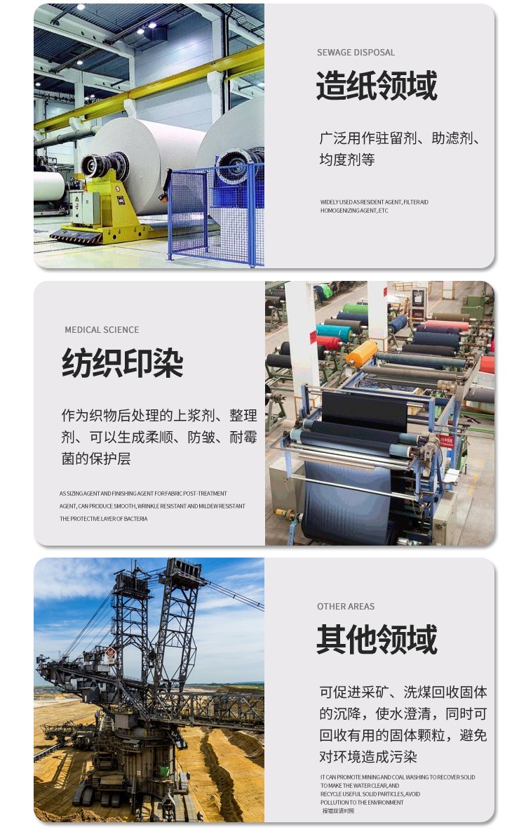 :是水溶性的高分子聚合物, 主要用于各種工業(yè)廢水的絮凝沉降,沉淀澄清處理,如鋼鐵廠廢水,電鍍廠廢水,冶金廢水,洗煤廢水等污水處理、污泥脫水等。還可用于飲用水澄清和凈化處理。由于其分子鏈中含有一定數(shù)量的極性基團(tuán),它能通過吸附水中懸浮的固體粒子,使粒子間架橋或通過電荷中和使粒子凝聚形成大的絮凝物,故可加速懸浮液中粒子的沉降,有非常明顯的加快溶液澄清,促進(jìn)過濾等效果。